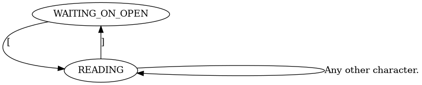 The state machine below shows a circle for each state and a transition for each incoming byte. We want our code to start in the WAITING_ON_OPEN